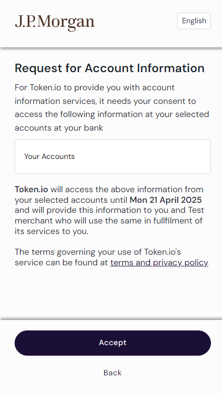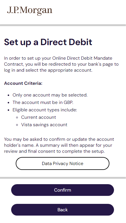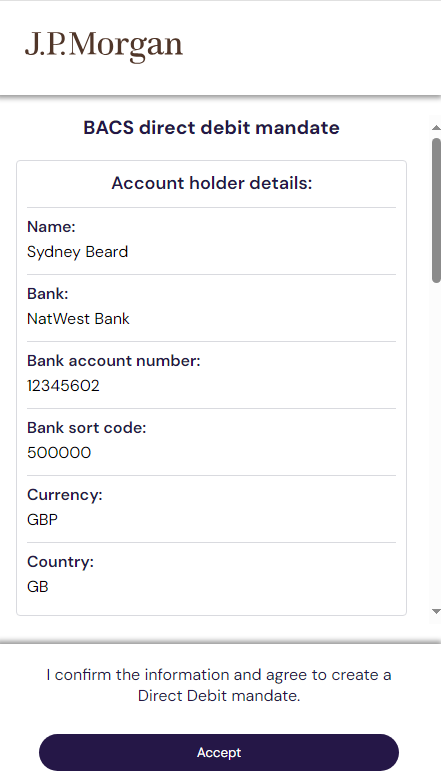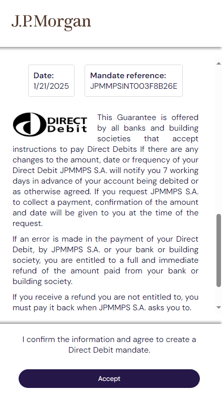 The Bacs mandate is created, and the customer is shown the mandate details. They agree to the terms and conditions and accept the mandate. JPM MPS always acts as the creditor in the payment process. Direct Debit standard consent is also needed in the last step.