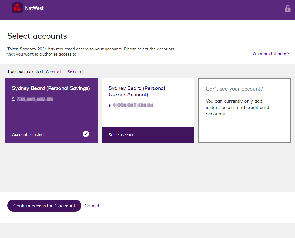 After successful login and authentication, the customer chooses the bank account they wish to use for the Bacs mandate. Only one account may be selected, in GBP, and either a current account or Vista savings account.