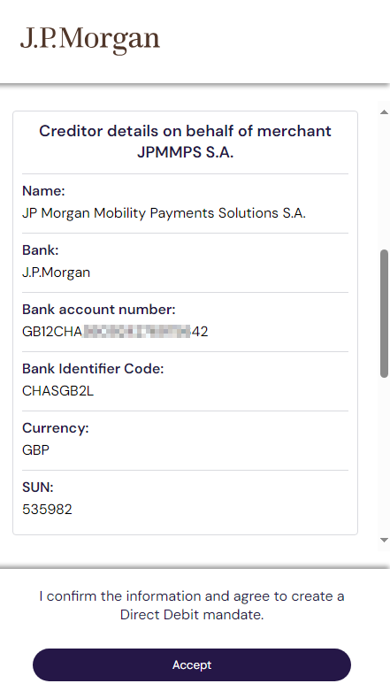 Please note that J.P. Morgan Mobility Payments Solutions S.A. is used as Creditor in payments. Once activated, the Bacs mandate is ready for use in Customer-Initiated Transactions (CIT), regular Merchant-Initiated Transactions (MIT) and MIT Payment Series.