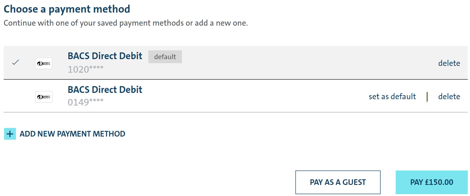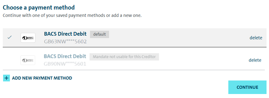 The customer should have the ability to press the button for adding a new payment method, for example, "Add new payment method" or "Register Bacs mandate" (for more information on, visit Decoupled Mandate Registration).
