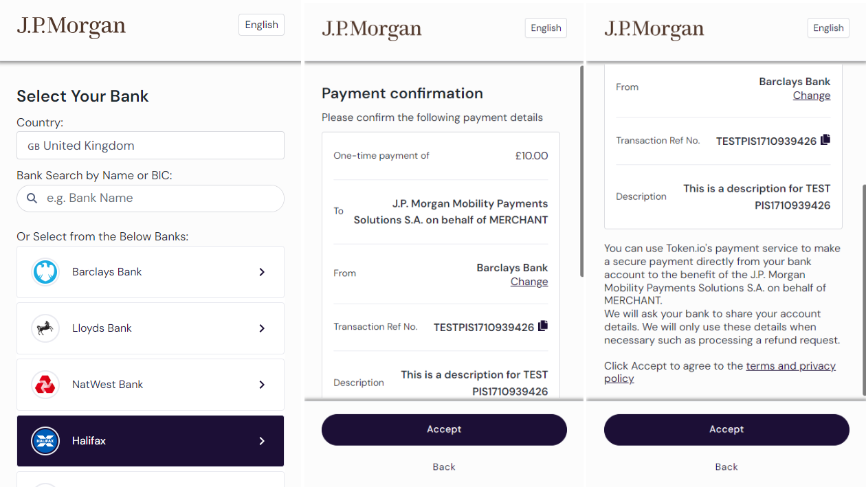 - The customer selects their bank, reviews payment details and accepts terms and conditions.